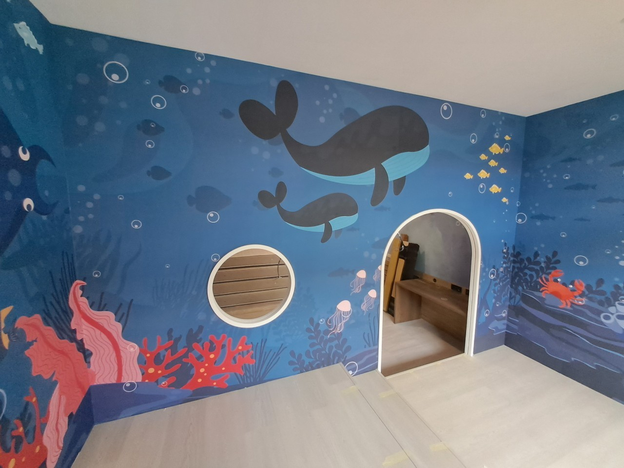 精準處理室內轉角與大面積拼接,讓動畫場景 100% 包覆空間。細膩的拼縫技術,讓粉絲在拍照時感受到完全的沉浸感。