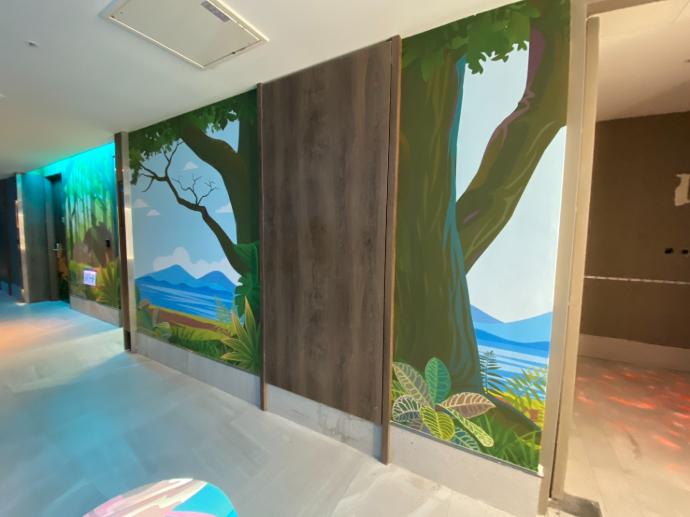 專為飯店宴會廳與大廳活動設計。提供牆面到側邊的完美對花拼縫,打造全幅視覺包覆效果。高彩度輸出還原細膩插畫,瞬間將單調走廊轉化為專業的主題場域。