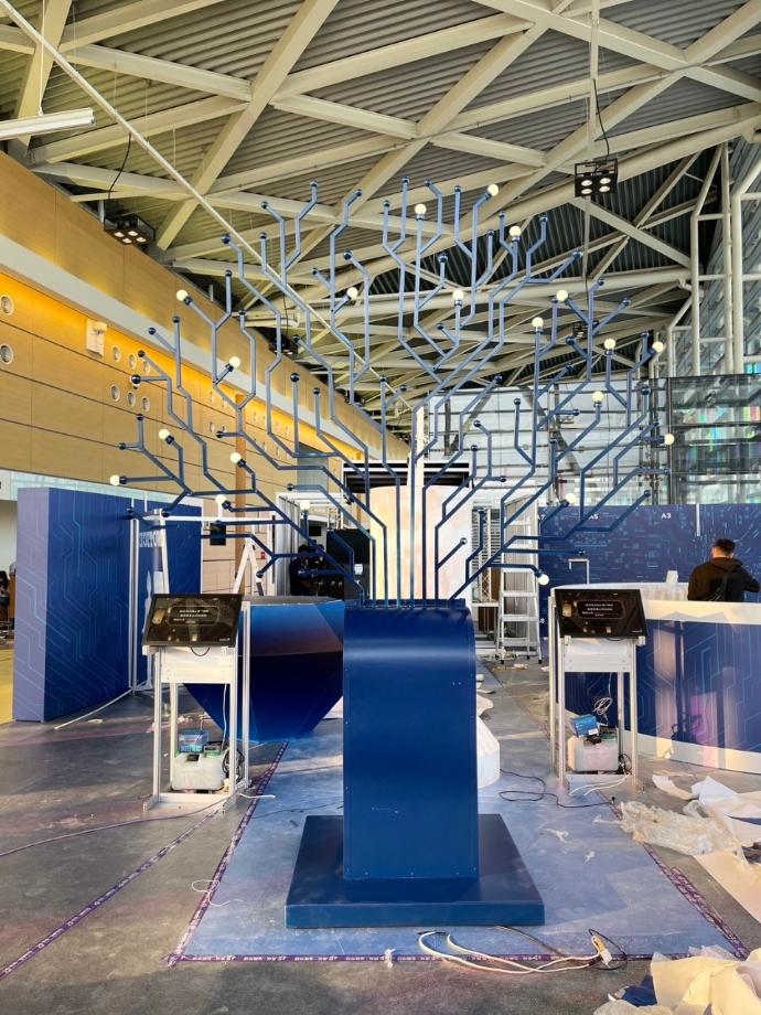 從大型金屬異型結構搭建到沈浸式視覺背景的整合方案。透過深藍色系與流線型電路設計,在南港展覽館有限的空間內,為您的品牌創造最具衝擊力的未來感舞台。